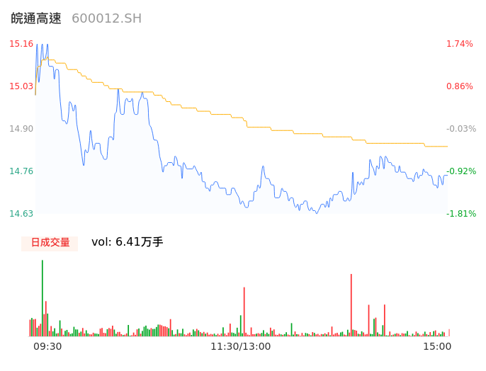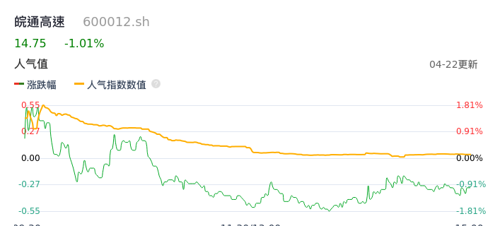 04月22日,皖通高速收报14.75,股价涨幅-1.01%,成交金额9507.61万元,换手率0.55%。