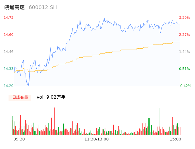 04月15日,皖通高速收报14.72,股价涨幅3.23%,成交金额1.31亿元,换手率0.77%。