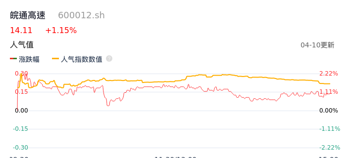 04月10日,皖通高速收报14.11,股价涨幅1.15%,成交金额7808.63万元,换手率0.47%。