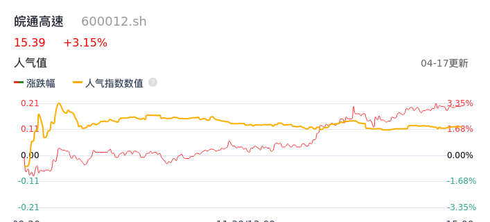04月17日,皖通高速收报15.39,股价涨幅3.15%,成交金额1.37亿元,换手率0.78%。