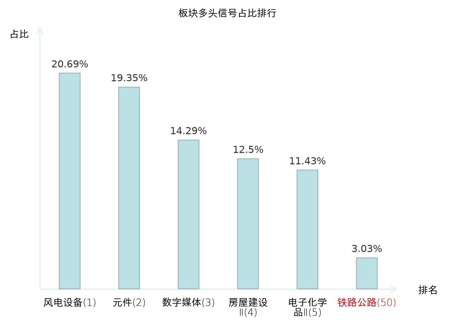 全市场所有行业板块中主力多头信号占比排名中,风电设备板块位居第一。房屋建设Ⅱ板块名次提升最快,较昨日上升116位。