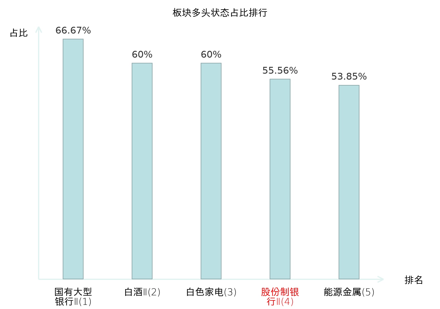 全市场所有行业板块中主力多头状态占比排名中,国有大型银行Ⅱ板块位居第一。电子化学品Ⅱ板块名次提升最快,较昨日上升55位。