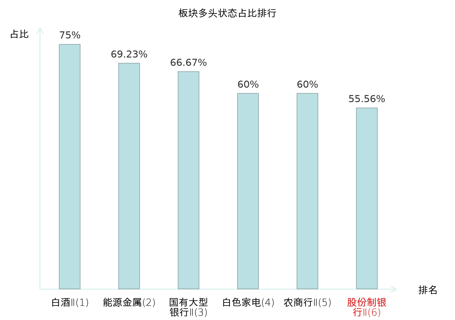 全市场所有行业板块中主力多头状态占比排名中,白酒Ⅱ板块位居第一。房地产服务板块名次提升最快,较昨日上升86位。