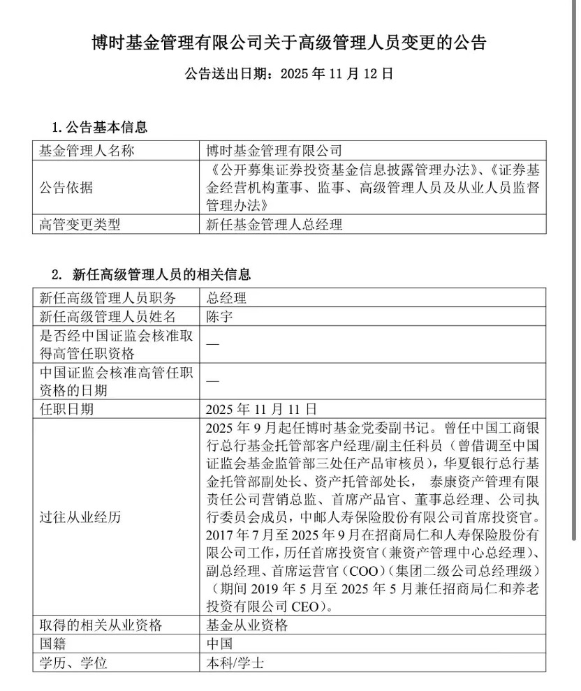 博时基金在公告中表示,公司党委副书记陈宇正式接任公司总经理一职,并已经第九届董事会2025年第七次临时会议审议并通过。