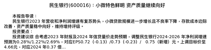 值得注意的是:2024年04月国泰君安的刘源/钟昌静分析师,首次发布关于民生银行的研究报告,标题为:民生银行(600016):小微特色鲜明 资产质量继续向好。