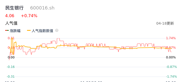 04月18日,民生银行收报4.06,股价涨幅0.74%,成交金额6.77亿元,换手率0.47%。