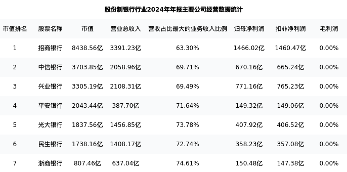 民生银行最新报告期数据为年报,下表汇总了股份制银行行业内市值靠前的公司年报主要经营数据