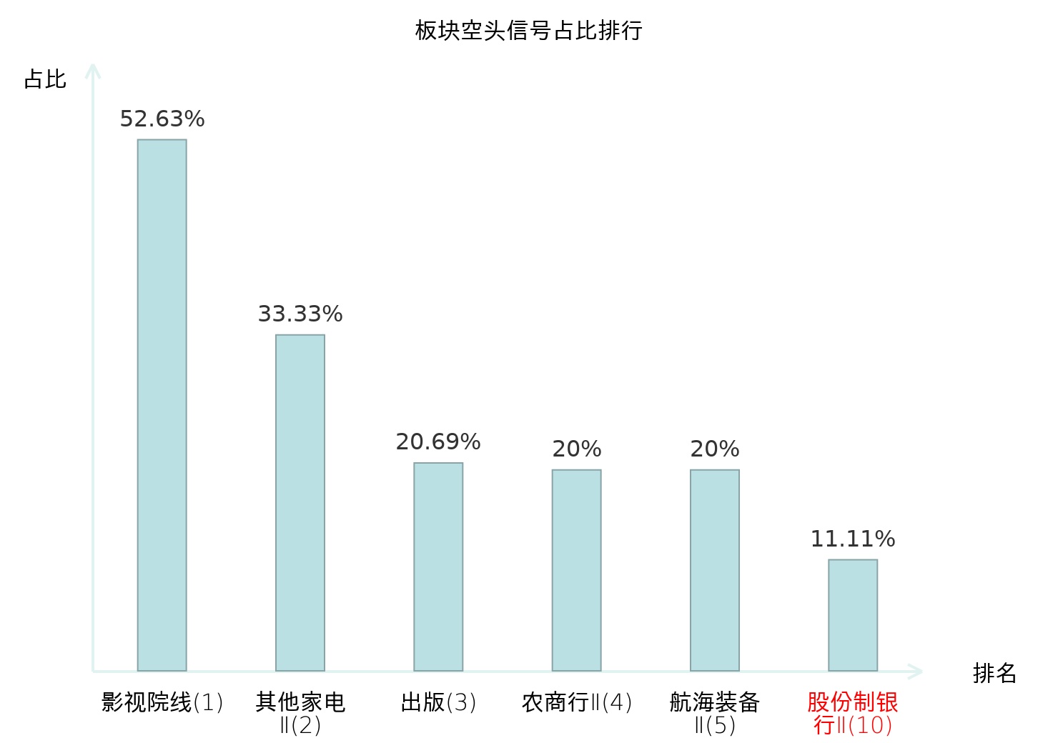 全市场所有行业板块中主力空头信号占比排名中,影视院线板块位居第一。出版板块名次提升最快,较昨日上升115位。