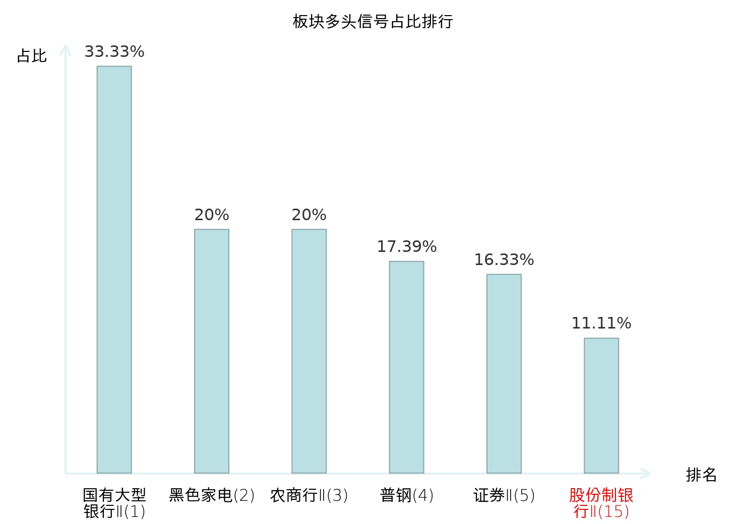 全市场所有行业板块中主力多头信号占比排名中,国有大型银行Ⅱ板块位居第一。国有大型银行Ⅱ板块名次提升最快,较昨日上升123位。