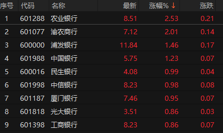 上证报中国证券网讯 11月12日早盘,银行板块走强,截至9时47分,农业银行涨超2%,盘中续创历史新高,渝农商行涨逾2%,浦发银行、中国银行涨超1%,民生银行、中信银行、厦门银行等涨幅靠前。