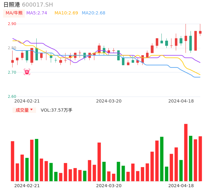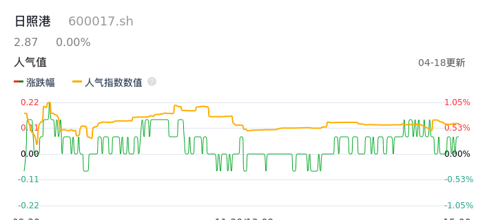 04月18日,日照港收报2.87,股价涨幅0.00%,成交金额1.08亿元,换手率1.22%。