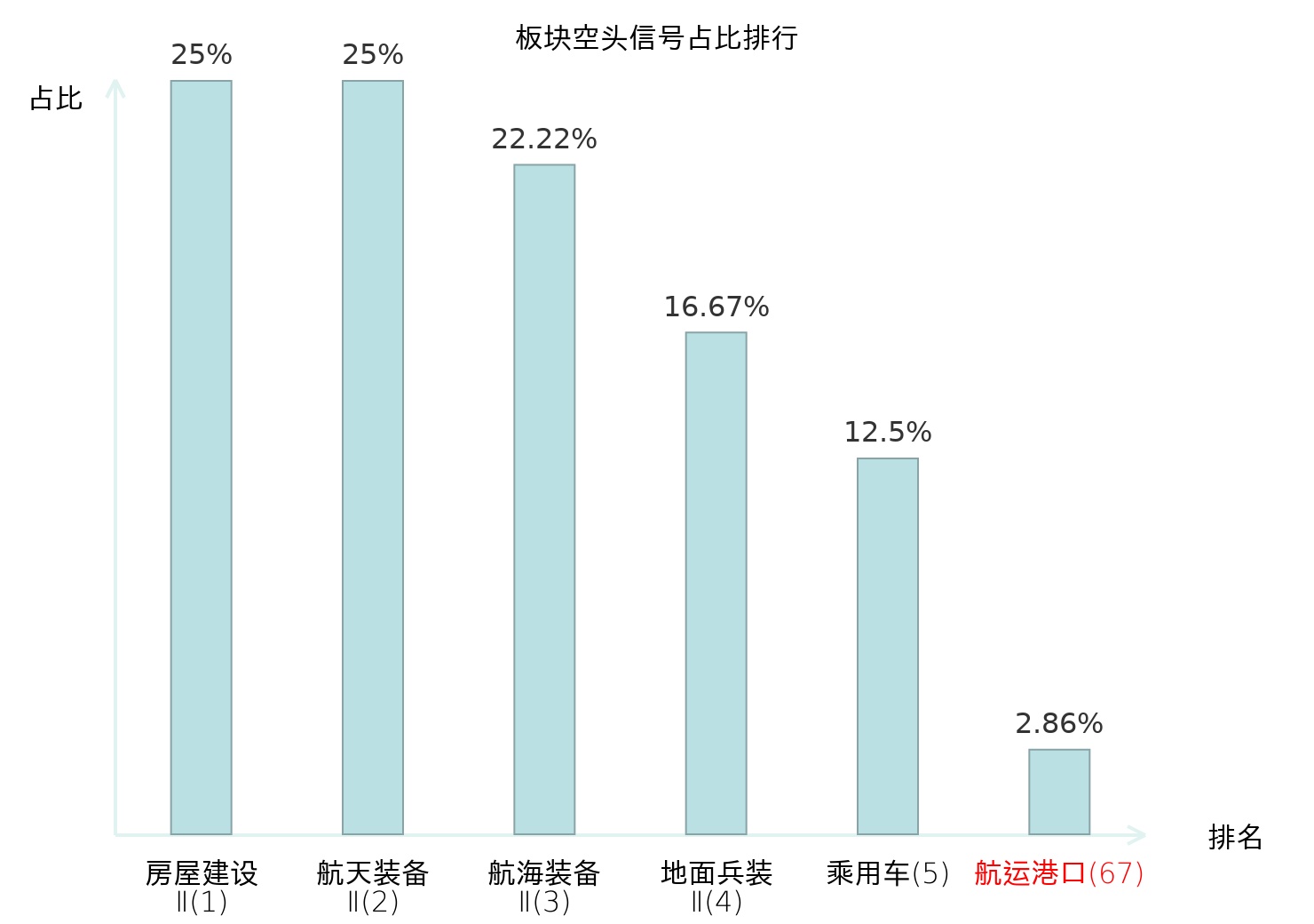 全市场所有行业板块中主力空头信号占比排名中,房屋建设Ⅱ板块位居第一。食品加工板块名次提升最快,较昨日上升110位。