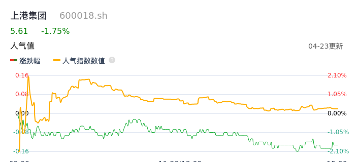 04月23日,上港集团收报5.61,股价涨幅-1.75%,成交金额1.34亿元,换手率0.10%。