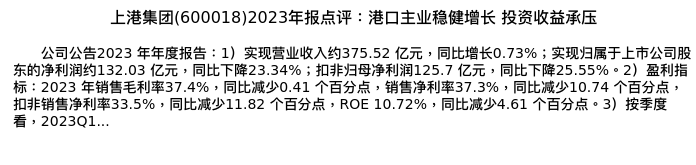 值得注意的是:2024年04月华创证券的吴一凡/吴晨玥/黄文鹤/梁婉怡分析师,首次发布关于上港集团的研究报告,标题为:上港集团(600018)2023年报点评:港口主业稳健增长 投资收益承压。