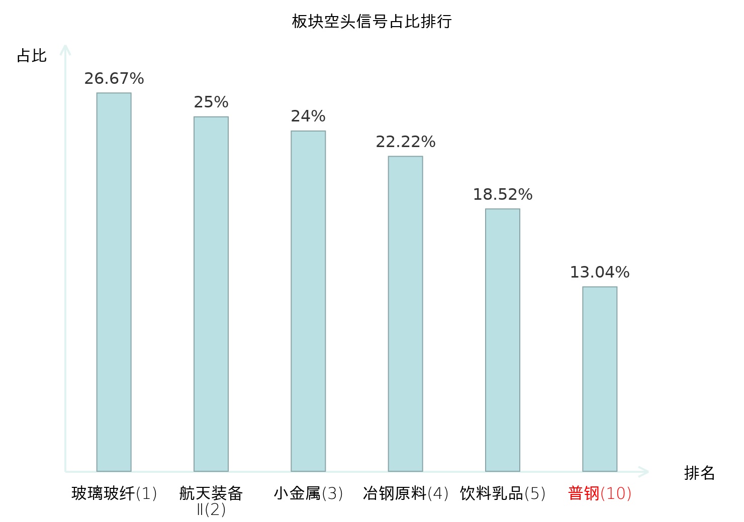 全市场所有行业板块中主力空头信号占比排名中,玻璃玻纤板块位居第一。普钢板块名次提升最快,较昨日上升113位。