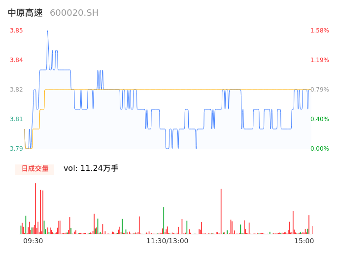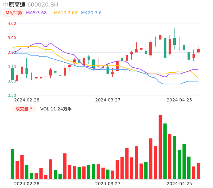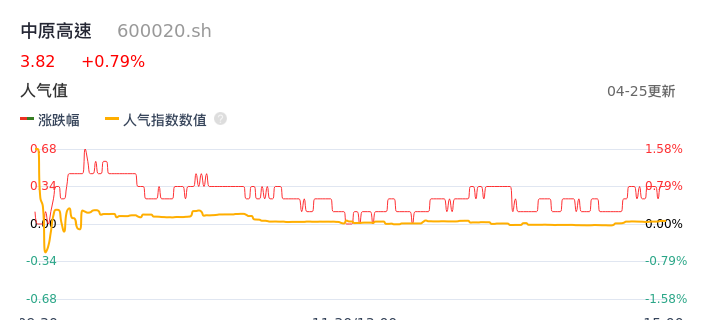04月25日,中原高速收报3.82,股价涨幅0.79%,成交金额4287.62万元,换手率0.50%。