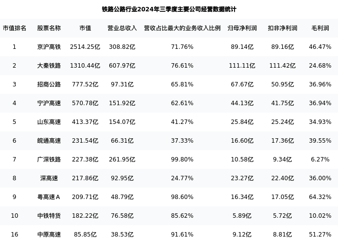 中原高速最新报告期数据为三季度,下表汇总了铁路公路行业内市值靠前的公司三季度主要经营数据