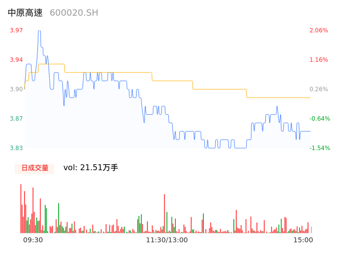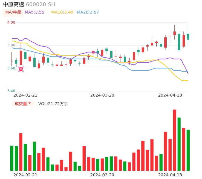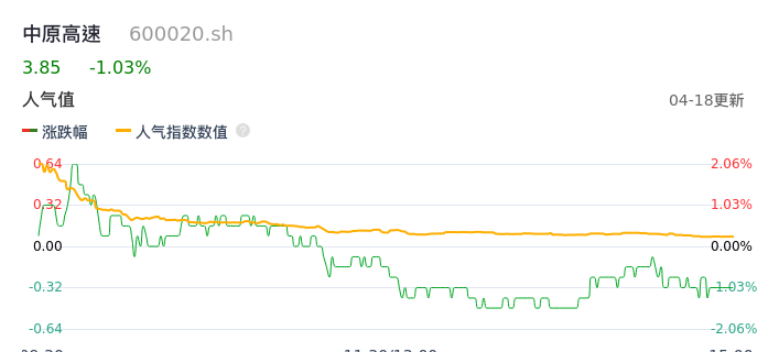 04月18日,中原高速收报3.85,股价涨幅-1.03%,成交金额8447.07万元,换手率0.97%。
