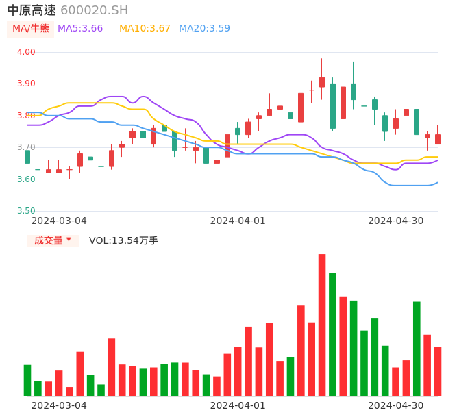 04月30日,中原高速收报3.74,股价涨幅0.00%,成交金额5064.21万元,换手率0.60%。