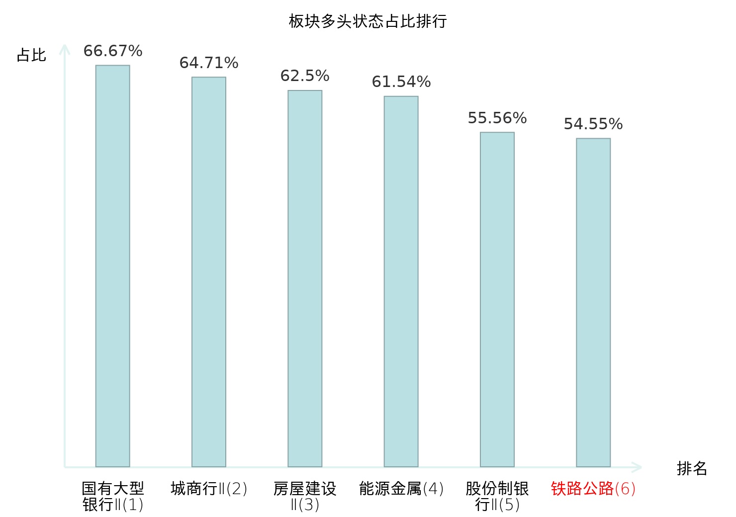 全市场所有行业板块中主力多头状态占比排名中,国有大型银行Ⅱ板块位居第一。普钢板块名次提升最快,较昨日上升65位。