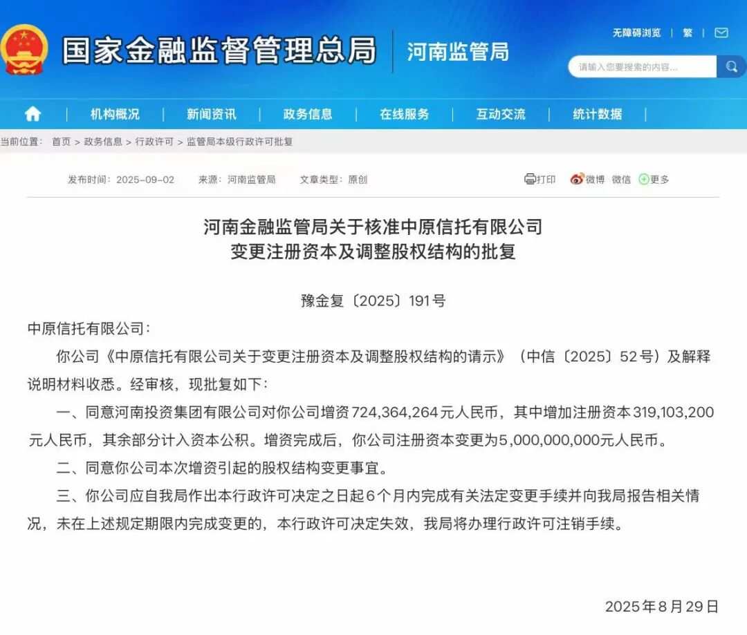 批覆信息显示,河南金融监管局同意河南投资集团有限公司(简称‘河南投资集团’)对中原信托有限公司(简称‘中原信托’)增资约7.24亿元,其中增加注册资本约3.19亿元,其余部分计入资本公积。增资完成后,中原信托注册资本变更为50亿元。
