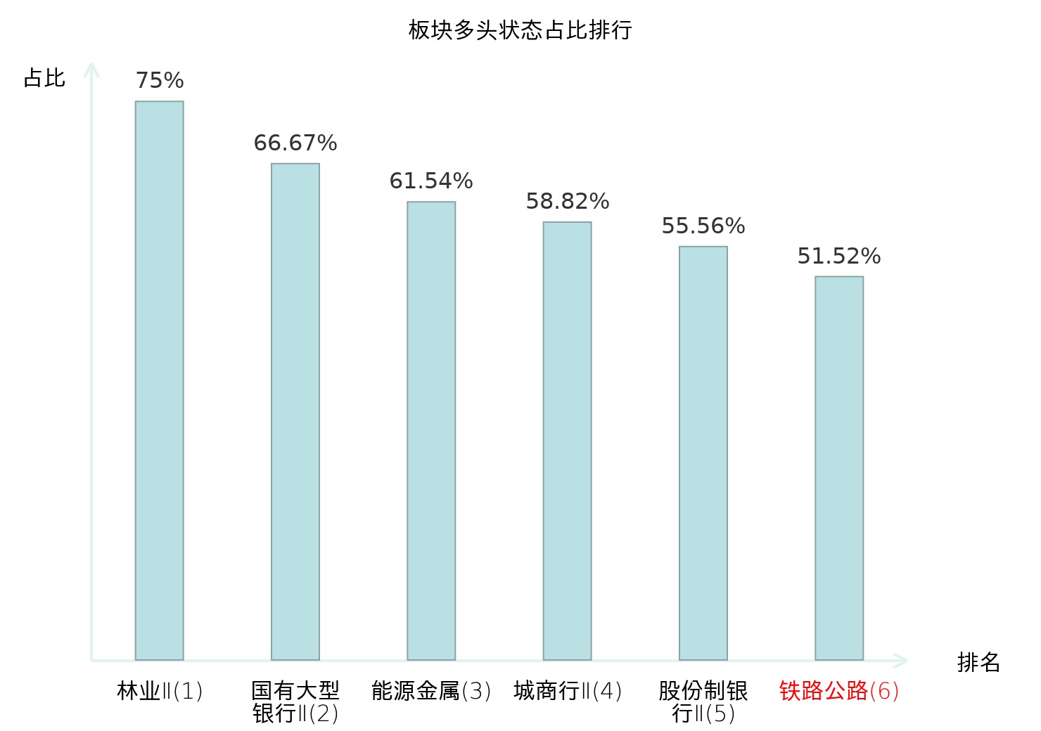 全市场所有行业板块中主力多头状态占比排名中,林业Ⅱ板块位居第一。专业连锁Ⅱ板块名次提升最快,较昨日上升63位。