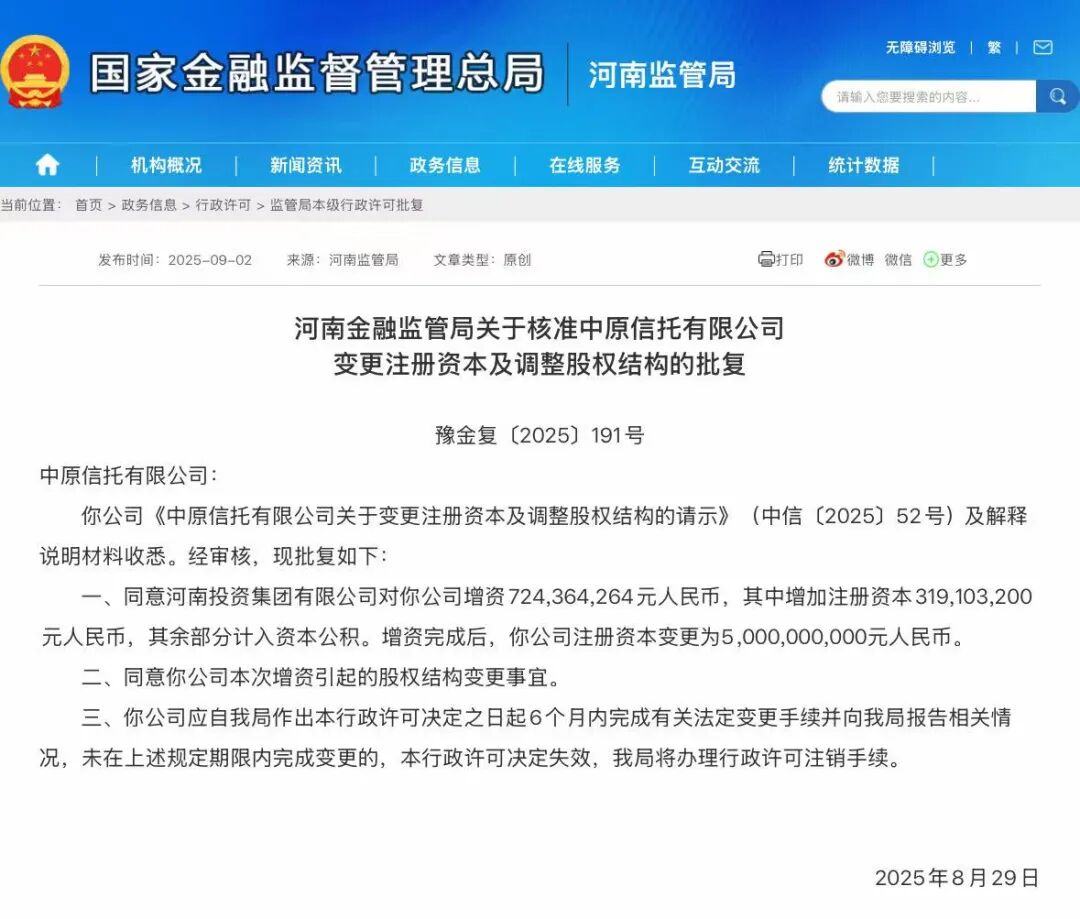 批复信息显示,河南金融监管局同意河南投资集团有限公司(简称“河南投资集团”)对中原信托有限公司(简称“中原信托”)增资约7.24亿元,其中增加注册资本约3.19亿元,其余部分计入资本公积。增资完成后,中原信托注册资本变更为50亿元。