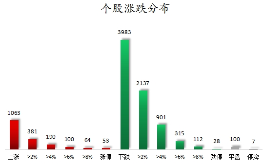 个股涨跌情况,截至收盘,沪深两市合计1063只个股上涨,3983只个股下跌,平盘个股100只,停牌的个股7只。不含当日上市新股,共有53只个股涨停,28只个股跌停。