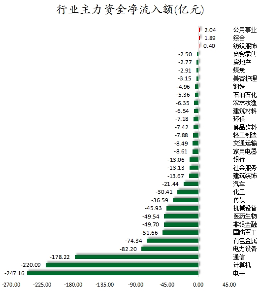 从行业来看,申万所属的31个一级行业,今日仅有公用事业、综合、纺织服饰3个行业主力资金呈现净流入,净流入金额分别为2.04亿元、1.89亿元、0.4亿元。28个行业主力资金呈现净流出,其中,电子行业主力资金净流出最多,净流出金额为247.16亿元;行业主力资金净流出靠前的还有计算机、通信、电力设备、有色金属、国防军工、非银金融等,净流出金额分别为220.09亿元、178.22亿元、82.2亿元、74.34亿元、51.66亿元、49.7亿元。