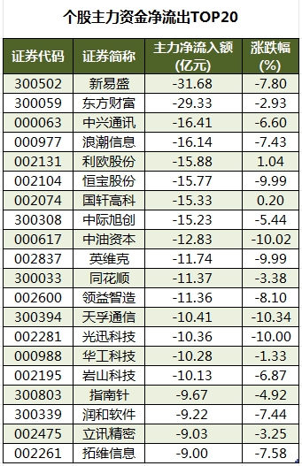 今日有3493只个股被主力资金净卖出,其中,303股被主力资金净卖出超1亿元。主力资金净流出最多的个股是新易盛,净流出金额为31.68亿元;主力资金净流出居前的个股还有东方财富、中兴通讯、浪潮信息、利欧股份、恒宝股份等,净流出金额分别为29.33亿元、16.41亿元、16.14亿元、15.88亿元、15.77亿元。