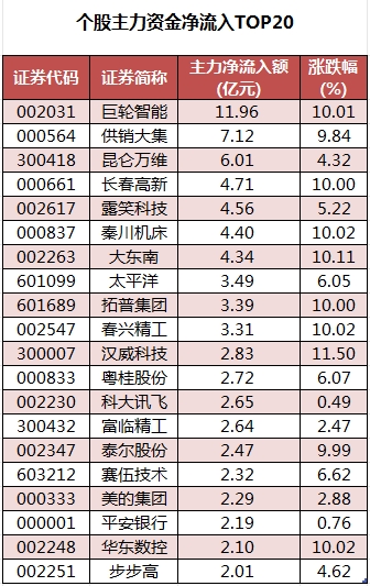 个股来看,今日有1649只个股获主力资金净流入,其中,54股获主力资金净流入超1亿元。巨轮智能主力资金净流入最多,净流入金额为11.96亿元;主力资金净流入居前的个股还有供销大集、昆仑万维、长春高新、露笑科技、秦川机床等,净流入金额分别为7.12亿元、6.01亿元、4.71亿元、4.56亿元、4.4亿元。