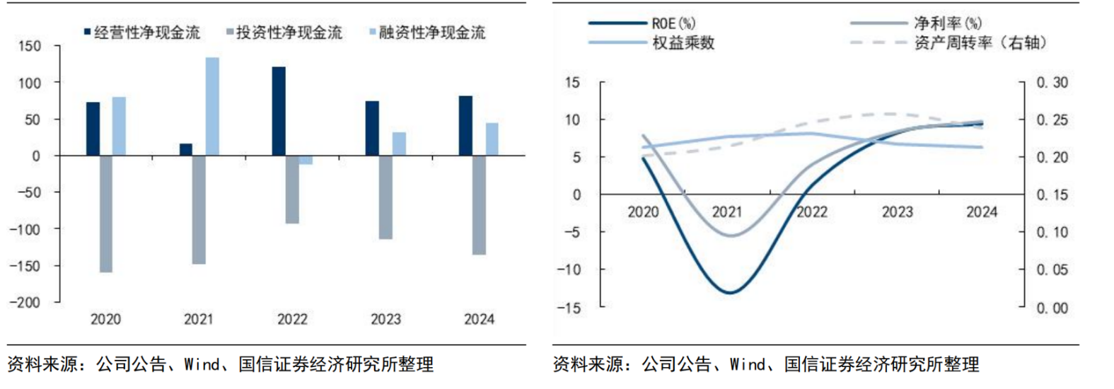 D)ROE提升,经营性净现金流改善。2024年,由于净利率上行,公司ROE提升,较2023年同期增加1.19pct至9.33%。现金流方面,2024年,公司经营性净现金流为81.72亿元,同比增长10.35%,主要系燃煤成本下降所致;投资性净现金流流出135.32亿元,同比有所增长,主要系基建投资增加所致;融资性净现金流44.40亿元,同比增长38.98%,主要系归还债务同比减少所致。