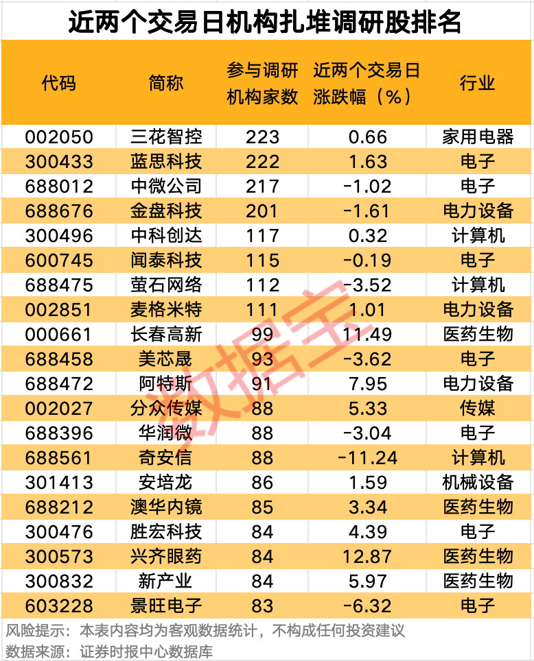 近两个交易日(8月29日至9月1日)共有186家公司公告机构调研记录。其中,8家公司获逾百家机构扎堆调研,三花智控参与调研机构家数最多,达223家,蓝思科技、中微公司、金盘科技等参与调研机构家数均超200家。