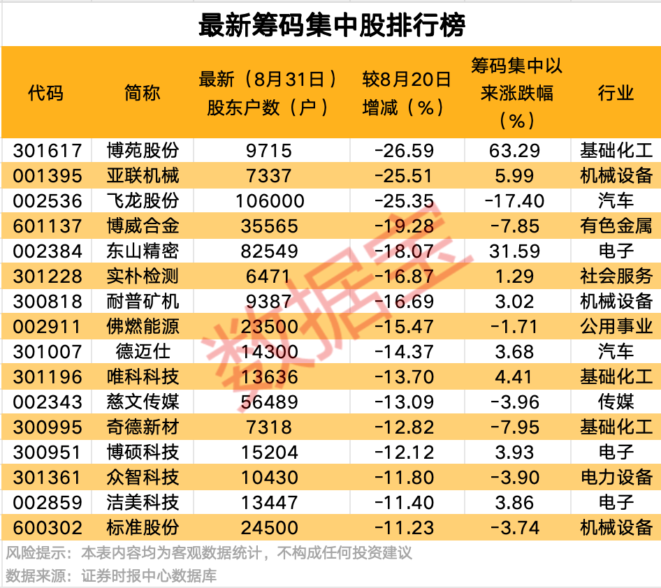 股东户数降幅最多的是博苑股份,截至8月31日最新股东户数为9715户,较8月20日下降26.59%;其次是亚联机械,截至8月31日最新股东户数为7337户,较8月20日下降25.51%;飞龙股份最新股东户数环比下降25.35%。