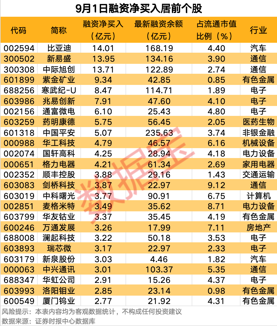 具体到个股,9月1日获融资净买入千万元以上的有779股,其中89股融资净买入额均超亿元。比亚迪融资净买入额居首,当日净买入14.01亿元,其次是新易盛、中际旭创,融资净买入金额分别为13.95亿元、13.71亿元,融资净买入金额居前的还有紫金矿业、寒武纪-U、兆易创新等。