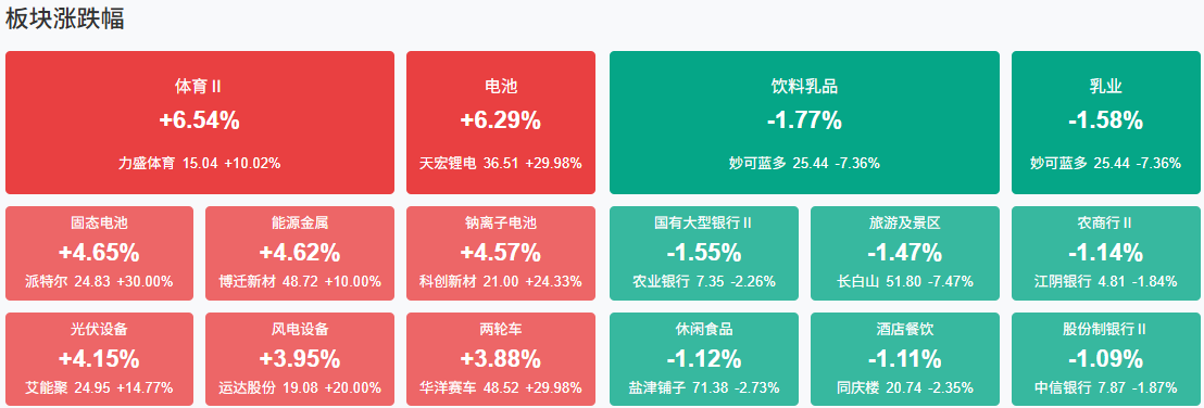 板块方面,固态电池、光伏、风电、CPO等板块涨幅居前,旅游、保险、银行、白酒等板块跌幅居前。截至收盘,沪指涨0.35%,深成指涨2.01%,创业板指涨3.48%。