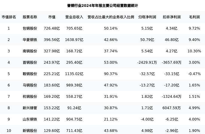 山东钢铁最新报告期数据为年报,下表汇总了普钢行业内市值靠前的公司年报主要经营数据