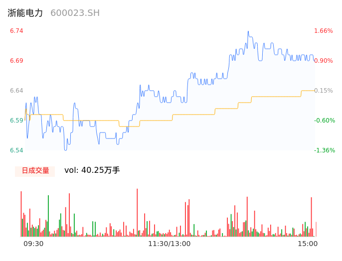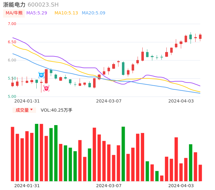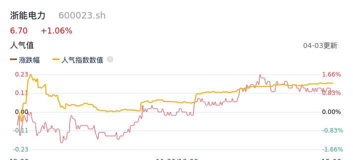 04月03日,浙能电力收报6.70,股价涨幅1.06%,成交金额2.67亿元,换手率0.30%。