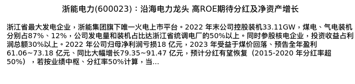 值得注意的是:2024年03月广发证券的郭鹏/姜涛/许子怡分析师,首次发布关于浙能电力的研究报告,标题为:浙能电力(600023):沿海电力龙头 高ROE期待分红及净资产增长。