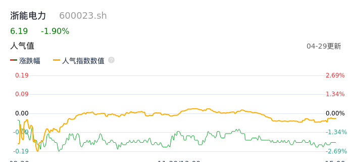 04月29日,浙能电力收报6.19,股价涨幅-1.90%,成交金额5.82亿元,换手率0.70%。