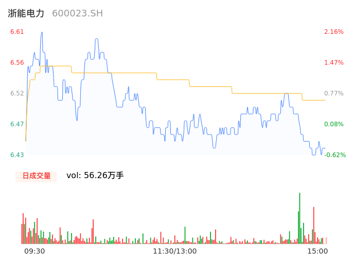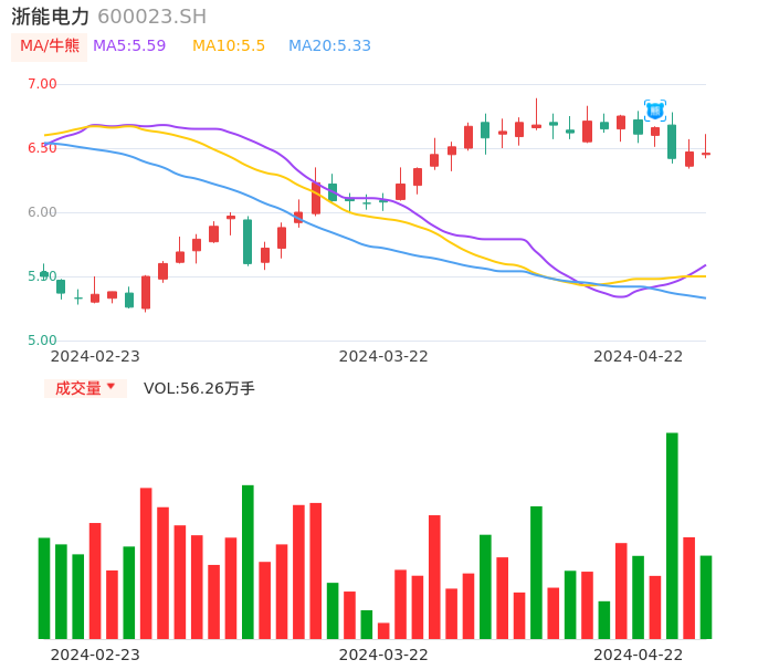 04月22日,浙能电力收报6.46,股价涨幅-0.15%,成交金额3.66亿元,换手率0.42%。
