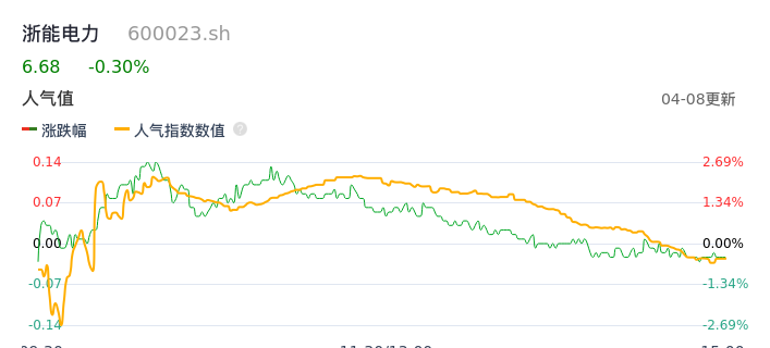 04月08日,浙能电力收报6.68,股价涨幅-0.30%,成交金额5.25亿元,换手率0.58%。
