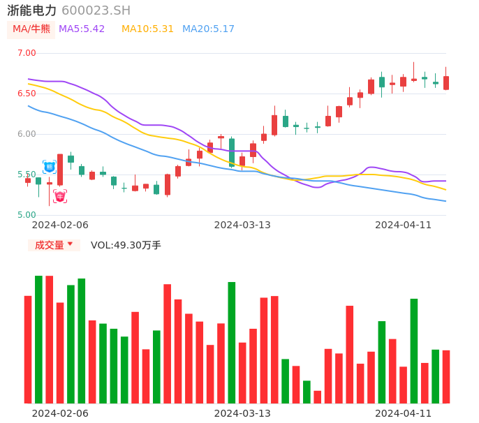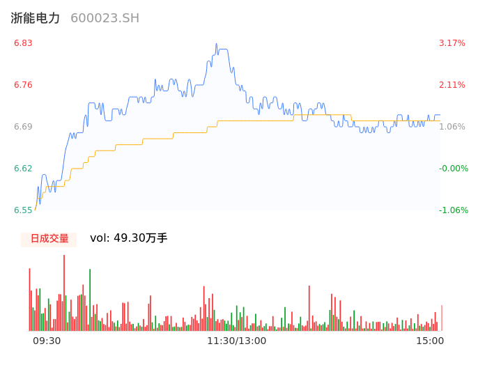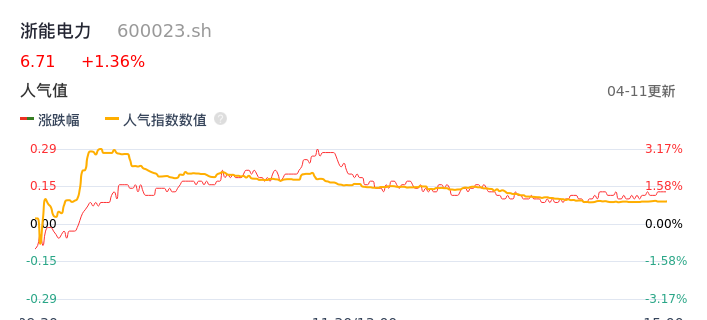 04月11日,浙能电力收报6.71,股价涨幅1.36%,成交金额3.30亿元,换手率0.37%。