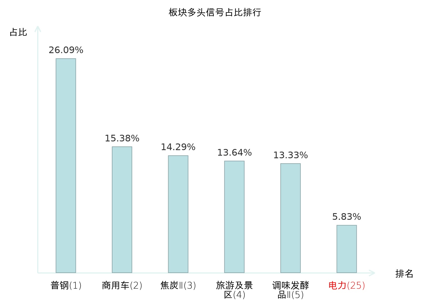 全市场所有行业板块中主力多头信号占比排名中,普钢板块位居第一。焦炭Ⅱ板块名次提升最快,较昨日上升119位。