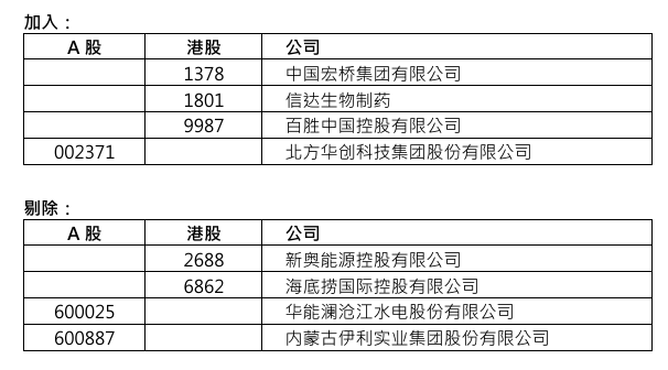 智通财经APP获悉,11月21日,恒生指数有限公司与香港交易及结算所有限公司(香港交易所)宣布,截至2025年9月30日之恒生香港交易所沪深港通中国企业指数的季度指数检讨结果。成份股数目仍维持80只,其中,中国宏桥(01378)、信达生物(01801)、百胜中国(09987)和北方华创(002371.SZ)4只成份股获纳入,新奥能源(02688)、华能水电(600025.SH)和伊利股份(600887.SH)等4只成分份遭剔除。有关变动将于2025年12月8日(星期一)起生效。