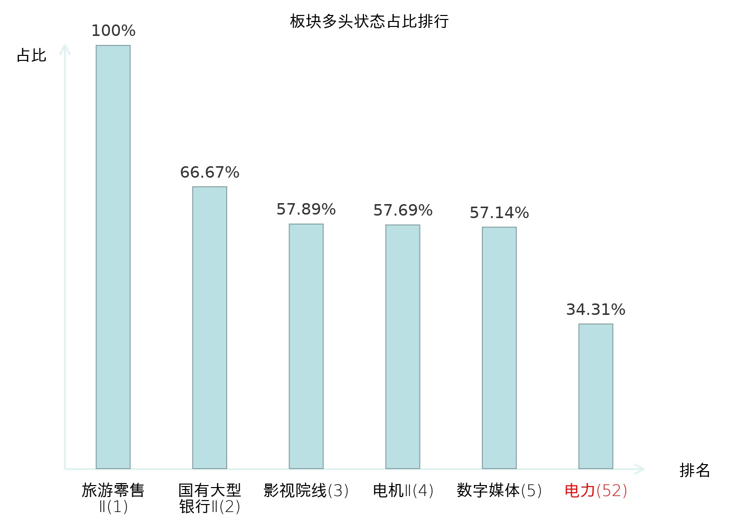 全市场所有行业板块中主力多头状态占比排名中,旅游零售Ⅱ板块位居第一。专业连锁Ⅱ板块名次提升最快,较昨日上升56位。