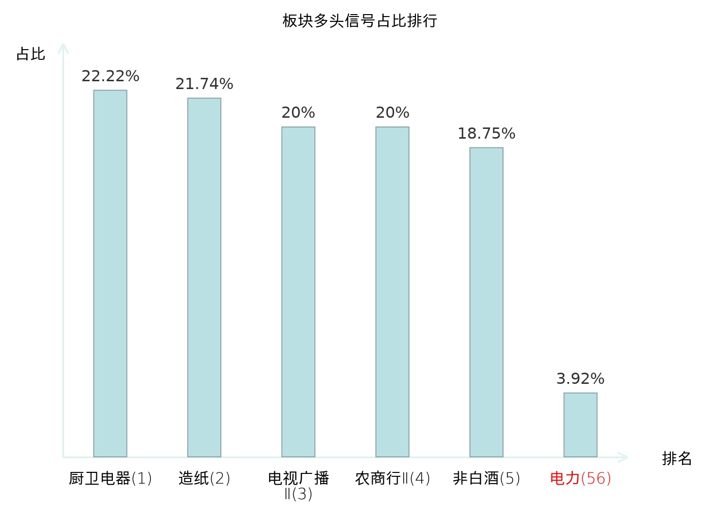 全市场所有行业板块中主力多头信号占比排名中,厨卫电器板块位居第一。厨卫电器板块名次提升最快,较昨日上升115位。