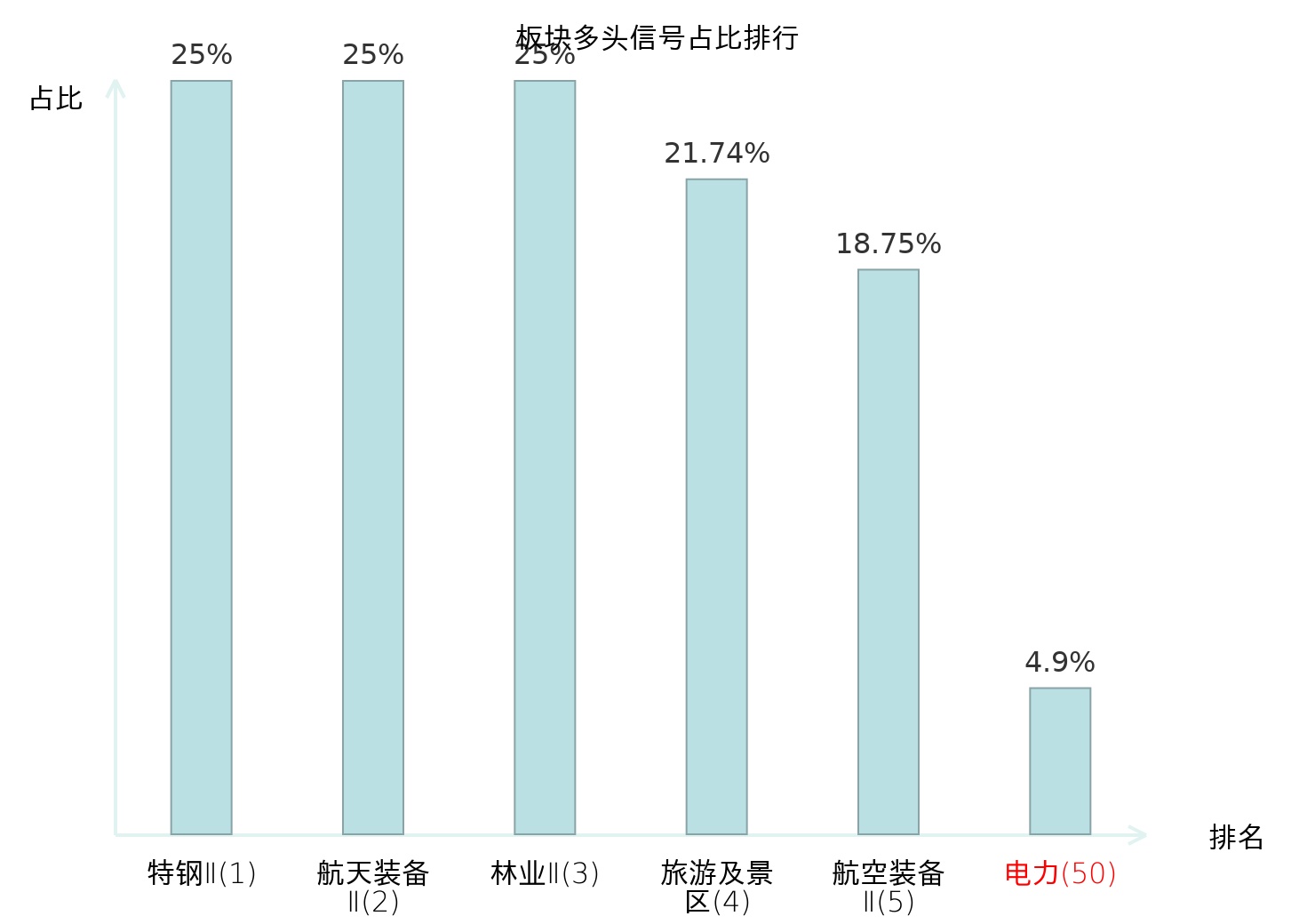 全市场所有行业板块中主力多头信号占比排名中,特钢Ⅱ板块位居第一。林业Ⅱ板块名次提升最快,较昨日上升122位。