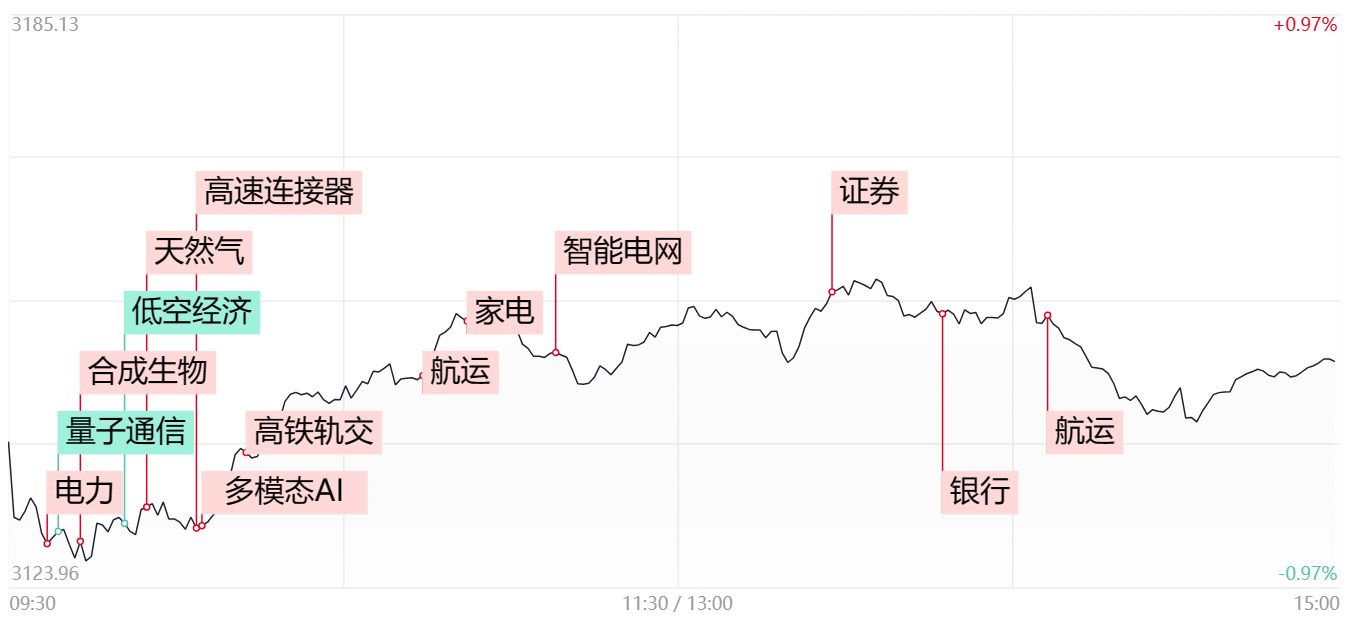市场全天震荡调整,创业板指领跌,沪指相对偏强。盘面上,燃气、电力等公用事业板块逆势走强,洪通燃气、西昌电力、明星电力涨停。出海概念股盘中拉升,其中家电股大涨,TCL智家涨停,长虹美菱涨超7%;电网概念股震荡走高,海兴电力、泰永长征、积成电子涨停。高铁概念股一度冲高,雷尔伟、康尼机电、思维列控涨停。航运股再度活跃,宁波远洋、凤凰航运涨停。下跌方面,量子科技概念股集体调整,科大国创等多股跌超10%。