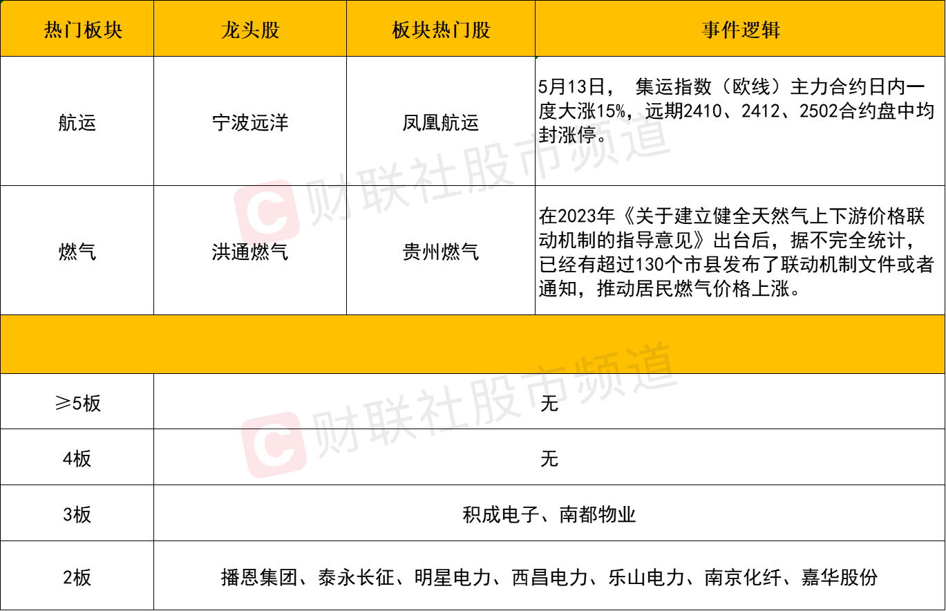 航运港口于盘中震荡拉升,宁波远洋、凤凰航运涨停,国航远洋、中远海能、中远海控、招商轮船等个股涨幅居前。消息面上,据数据机构Freightos提供的数据,自4月以来,从亚洲出发的集装箱运价已上涨约1000美元/FEU。运往美国西海岸和北欧航线的价格升至约4000美元/FEU,地中海航线的运价上涨到约5000美元/FEU。5月13日,集运指数(欧线)主力合约日内一度大涨15%,远期2410、2412、2502合约盘中均封涨停。